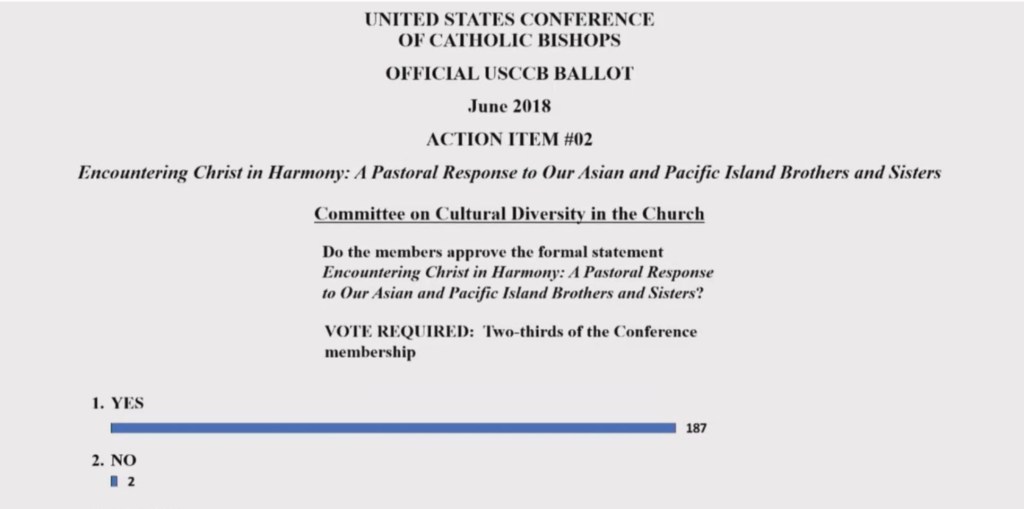 In 2014, the United States Conference of Catholic Bishops (USCCB) commissioned me to lead a national study of Asian and Pacific Island (API) American Catholics. Together with sociologists Jerry Park and Stephen Cherry, we conducted a national, mixed-methods study (survey, focus groups, interviews, field observation, and secondary data analysis) resulting in multiple reports/presentations to the USCCB. This week, the US Catholic Bishops voted to approve the pastoral letter that was written in consideration of this social science data on lived API experiences. It was an honor to present our work during the USCCB Spring Assembly, and to see this pastoral letter formally approved.