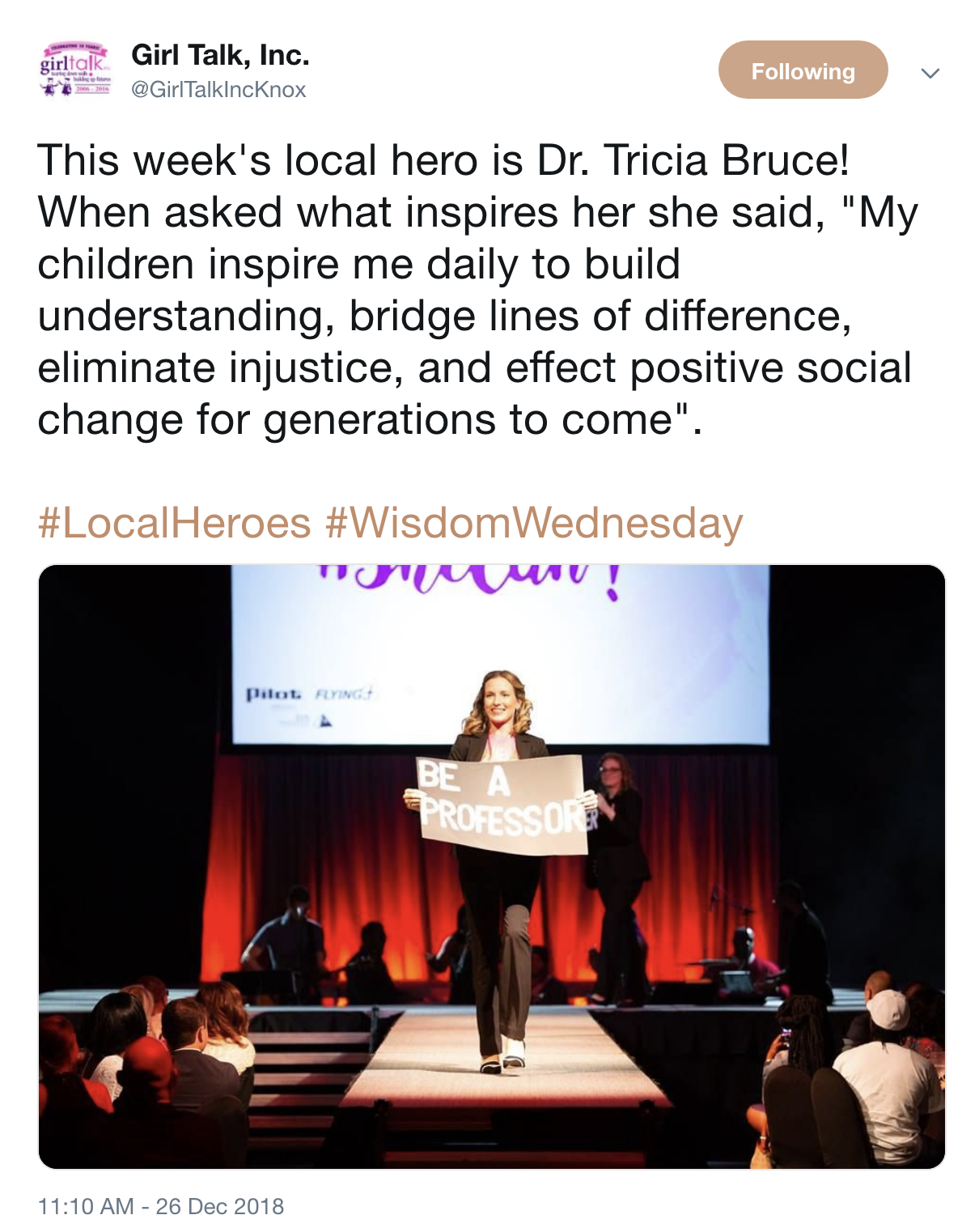 Thanks to Girl Talk, Inc. Knoxville for this kind shoutout, and for their powerful advocacy for young women! Proud to be joining their board of directors in 2019, in union with their mission of “empower[ing] girls to become their best selves through reducing the likelihood of teen pregnancy and helping them to advance educationally.”